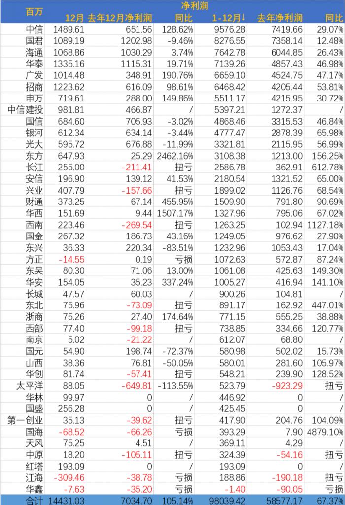 1-12月分月度统计数据表明,包含未在A股上市的券商在内,预估券商行业全年实现净利润超过千亿。
