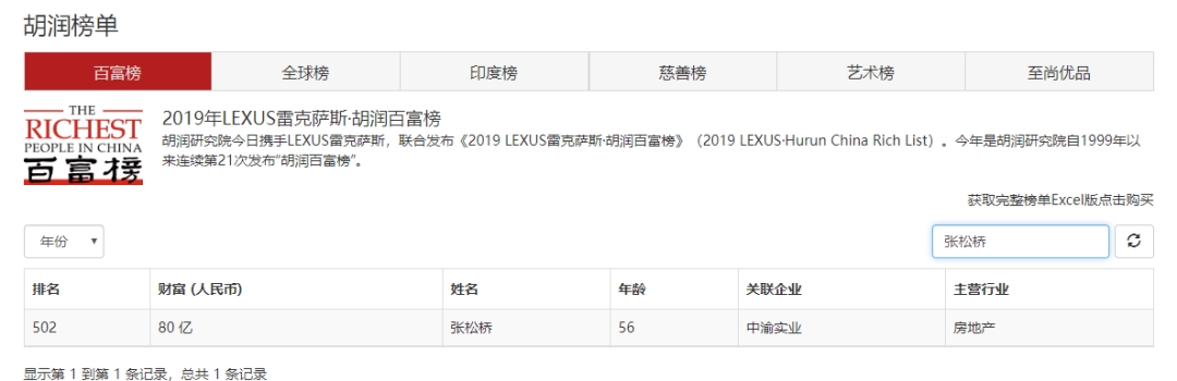 在《2019年胡润百富榜》中,张松桥以80亿元人民币财富排名502位。