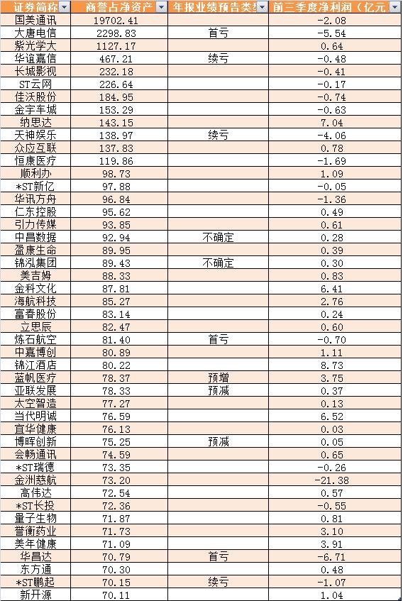 同时,截至三季报,共有49只股票的商誉占总资产比例超过40%,12股的商誉占总资产比例超50%。