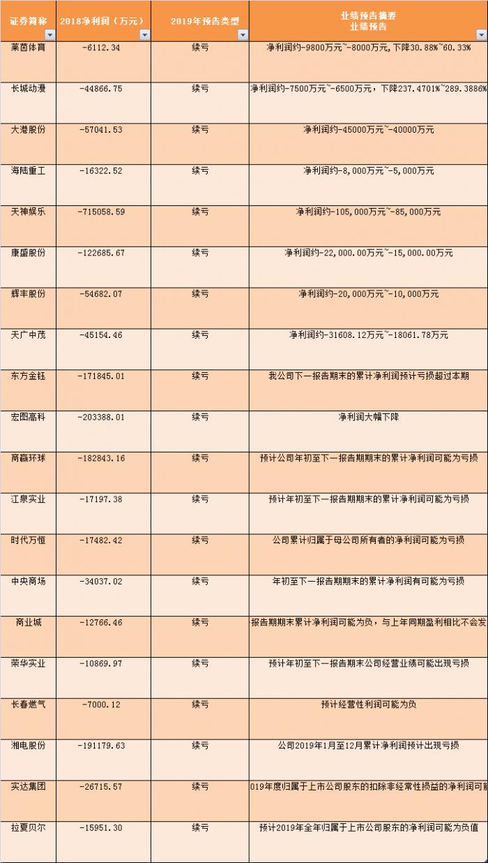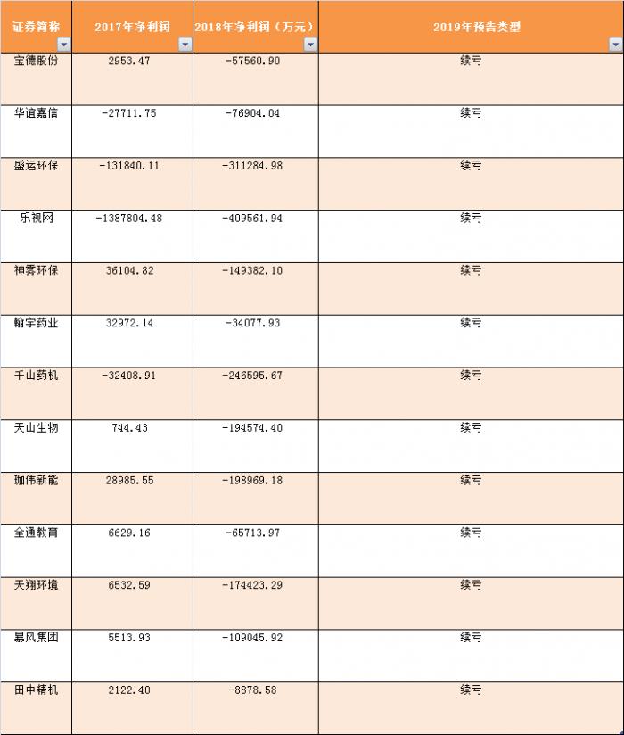 从目前公布的情况来看,13家创业板上市公司,2018年亏损且2019年预计亏损,华谊嘉信、盛运环保、乐视网、千山药机连续三年亏损。