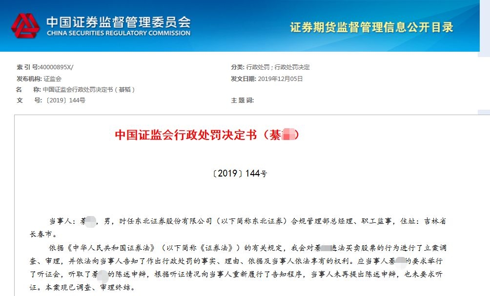 处罚决定书显示,綦某自2004年5月起任职于东北证券,2004年11月19日取得证券从业资格,2012年5月至2015年1月在东北证券稽核审计部担任总经理,2013年12月至证监会调查期间在东北证券担任职工监事。
