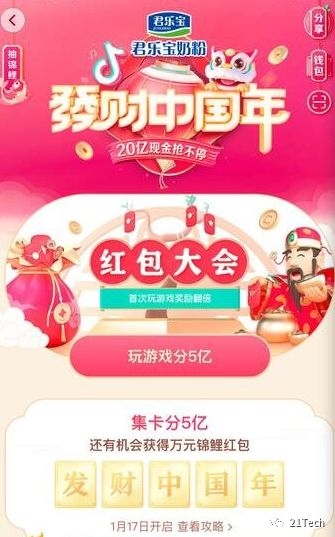 1月14日,字节跳动上线了“发财中国年”的春节活动,互动红包总额为20亿元。据21Tech了解,字节跳动旗下的所有产品均参与到该活动,具体又分为5个子活动,分别是”玩游戏分5亿“、”集卡分5亿”、“10000个万元锦鲤”、“5亿红包雨”及头号英雄答题活动。