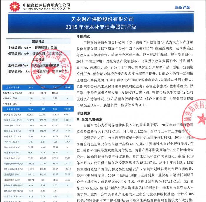 中债资信认为,天安财险在跟踪期内,公司保险业务收入基本保持稳定,随着资产不断出售,资产流动性降低,资产质量弱化;2019年前三季度,受投资资产收缩影响,公司投资收益大幅下滑,净利润大幅亏损,盈利能力弱化,公司1年内仍需兑付部分理财型产品,面临一定满期给付压力,偿付能力随着存续产品规模收缩有所提升。