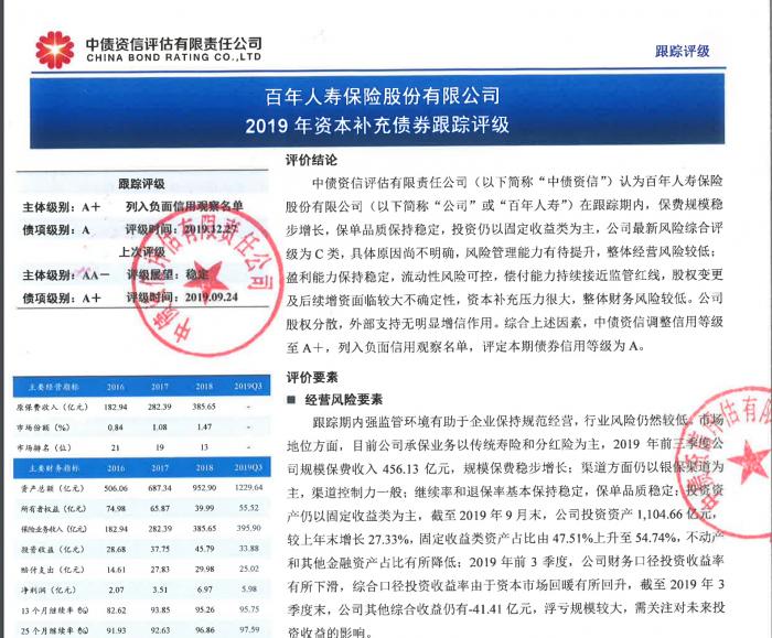 中债资信表示此次评级报告将百年人寿的主体等级由上次的“AA-”调整为“A+”,评级展望由上次的“稳定”调整为“列入负面信用观察名单”,债项等级由上次的“A+”调整为“A”。