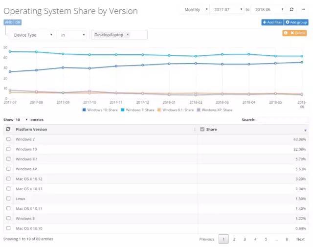 其次,直至现在Win 7都是很多人心目中“最好用”的操作系统。其中,Win7的媒体中心功能深受用户的喜爱,使用方便,信息显示直观。但再大的市场也禁不住微软狂推Win 10的决心。市场调查机构Netmarketshare报告显示,截至2018年6月Win 7仍处于绝对领先的地位,市场占有率高达 43.38%,而Win 10份额仅为32.08%。