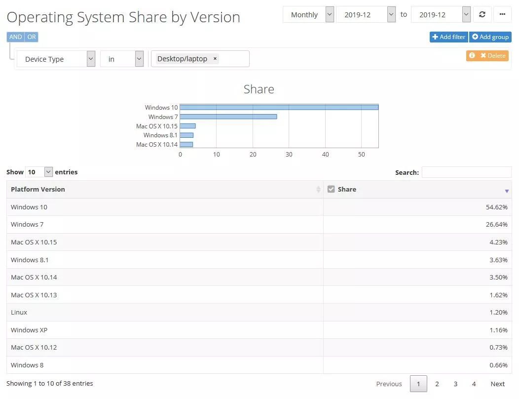 要知道,在此之前Win 10已经让用户“免费”使用了三年,成绩着实尴尬。近年来,微软更是加大了对Win 10的宣传。2018年12月,Win 10终于实现反超,占据39.22%市场份额,以微弱的优势超过了Win 7 36.9%的市场份额。或许是Win 10的反超坚定了微软“抛弃”Win 7的决心。2019年1月15日,微软官网发出声明,给出一年过渡期,2020年1月14日起,微软将停止支持Win7,不会提供安全补丁或更新等服务。截至2019年12月,Win 10系统市场份额占比达到54.62%,Win 7位居第二,占26.64%,但值得注意的是,在国内依然有超过57%的用户在使用Win 7。