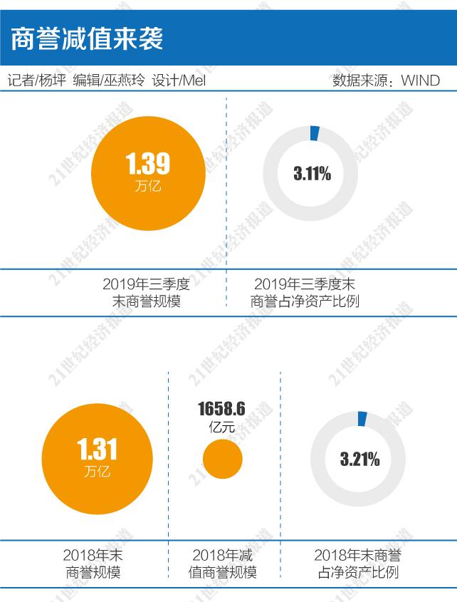 根据Wind数据,2019年三季度末,A股上市公司商誉总规模达到1.39万亿元,大体与2018年同期持平,仅比2018年年底高746亿元,商誉总额占两市上市公司总净资产的比重为3.11%,相较2018年年底的3.21%下降了0.1个百分点。