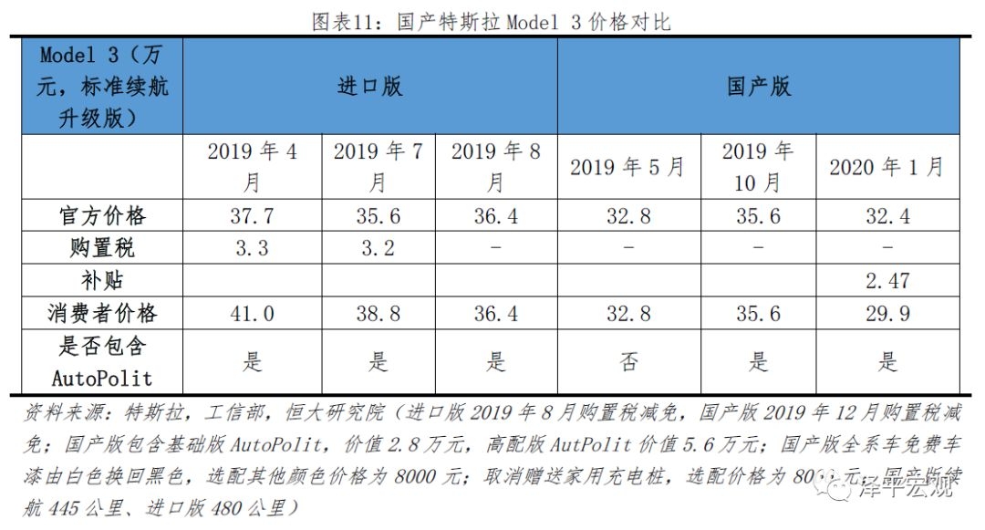 国产Model 3以低价策略搅动内地新能源汽车市场。作为国际化的重要战略之一,特斯拉高度重视内地新能源汽车市场,并于上海自建超级工厂,由于国内人工费用、固定资产费用较低,且上海市政府以贷款优惠政策吸引,特斯拉上海工厂的资本开支较美国工厂低65%。国产特斯拉将降价切入中高端市场,入门级Model 3价格低于30万元,并于2019年底完成首批员工交付。此次调价由三方面组成,第一方面,1月3日特斯拉官方宣布准续航升级版从35.58万元下调至32.38万元,降价幅度高达3.2万元。第二方面,于2019年12月6月入选第11批《新能源汽车推广应用推荐车型目录》,享受补贴24,750元/每辆。第三方面,于12月27日入选第29批《免征车辆购置税的新能源汽车车型目录》,享受购置税减免。三方面因素促成Model3入门价格从35.58万元下降至29.9万元,对比2019年4月进口版本,降价幅度高达38.8%。