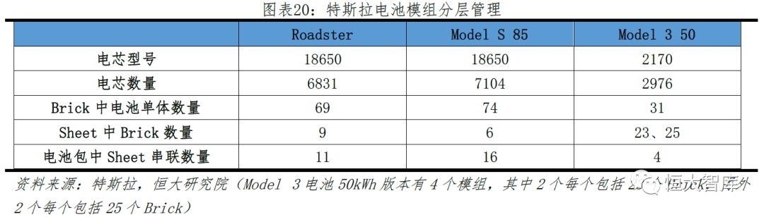 二、串并联组合、分层管理模式优化模组结构,提高电池充放电能力。特斯拉电池采用特有的串并联方式,按照“单体电池-brick-sheet-pack”顺序进行分层管理。例如,特斯拉将Roadster电池系统的6831节电池分成不同的子单元(4个模组中2个为23Brick/module,另外2个为25Brick/module,即2*23*31+2*25*31)进行并联和串联,多组串联和平板的设计,极大增加电池铺设数量和使用效率,从而提高整车动力性能和续航里程。