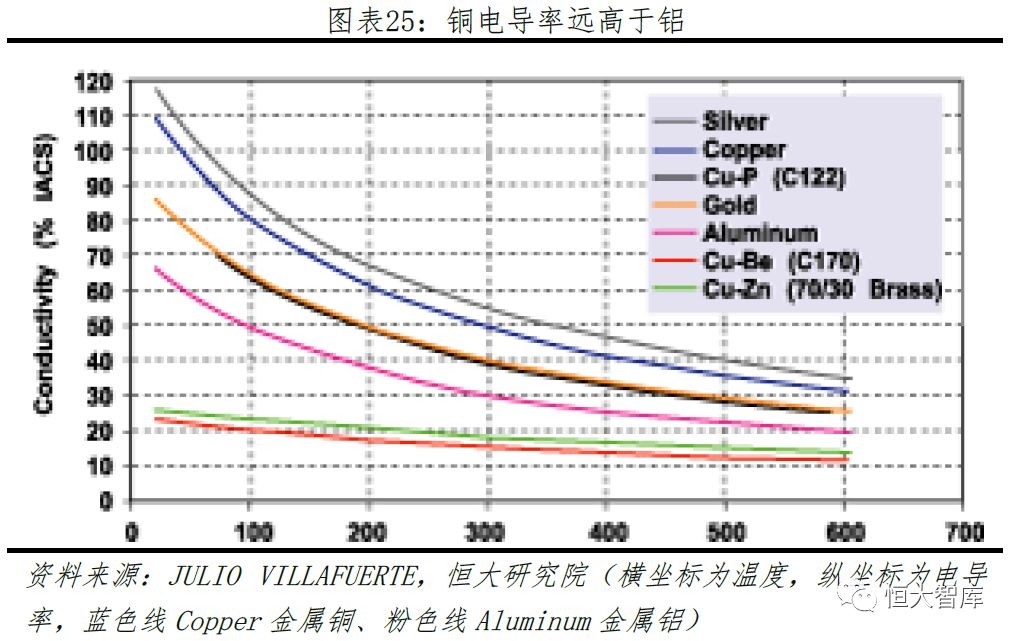 铜较铝带来更高的电导效率。从各项金属不同温度下的电导率来看,在相同温度下,铜的电导率远高于铝。如果将电机转子结构原材料换成铜,电机工作效率将大大提高。