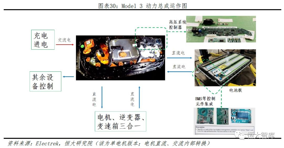 动力总成集成优化内部结构,有利缩减车型降低成本,形成价格竞争力。特斯拉一直保持包括电池包、BMS、冷却系统、电机等动力总成高度集成的特点。例如,无论是感应电机还是永磁开关磁阻电机,基本结构都为变速箱、逆变器和电机三体合一的结构。对比来看,每次推出新款车型,特斯拉都尽可能在原基础上集成升级。对比Model S/X,Model 3的车体减小约20%、价格降低约50%,为保证整车性能,特斯拉加入更多系统芯片来控制部件协调运作,并且将例如Model3的冷水机、电动阀、液冷罐等零部件集成为冷却液储阀罐,即Super Bottle,通过算法调节内部线路串并联结构,减少例如PTC加热器等零部件。