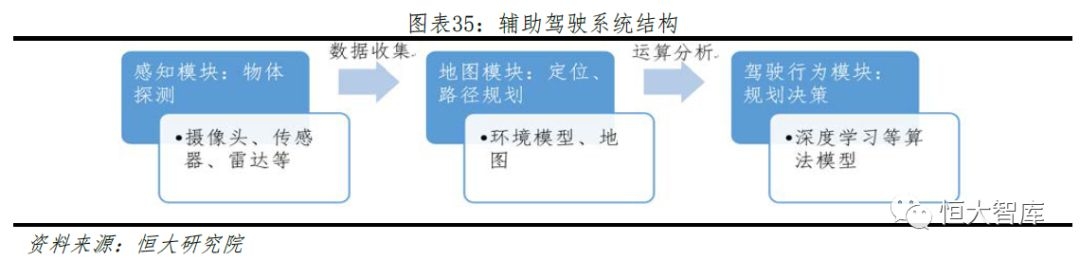 汽车辅助驾驶系统由软硬件组合构成,从结构框架来看,主要分为感知模块、地图模块、驾驶行为决策模块。从流程来看,感知模块通过雷达、传感器、摄像头等硬件,收集周围环境探测到的物体数据,地图模块提供定位和全局路径规划,数据共同传输到驾驶行为模块,为驾驶方案提供信息支持,最后决策模块控制车体转向、加速等实施行为。