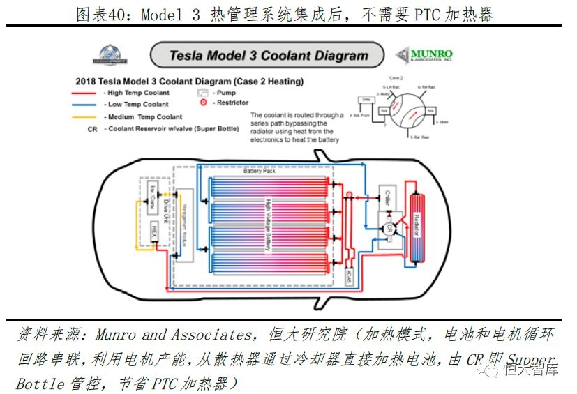 四、热管理系统温差设计合理,冷却路线丰富流畅,均温和能量管控能力突出。新能源汽车的热管理系统主要包括整车、座舱、电池三方面,进行整车温度控制、客舱空调加热制冷、电池过热散热过冷加热等。目前,主流热管理包括自然冷却、液冷和直冷三种方案,特斯拉采取50%水和50%乙二醇为冷却液的液冷方案,由四通阀实现的电机和电池冷却循环串并联结构。由系统芯片算法控制,当电池温度超过设定目标值时,电池循环与电机循环相互独立,采用并联;电池温度低于设定目标值时,电池循环与电机循环采取串联,利用电机余热为电池和座舱加热,多余热量将由进气口的热量交换器排放出去。此方案充分利用车内所有部件热量,使热量有效循环游走,极大提高电池单体散热性和电池单体间温度一致性。因此,无论冬季还是夏季所对应的极端气候,特斯拉车辆温差控制保持在2℃内,体现强大的温度管控能力。