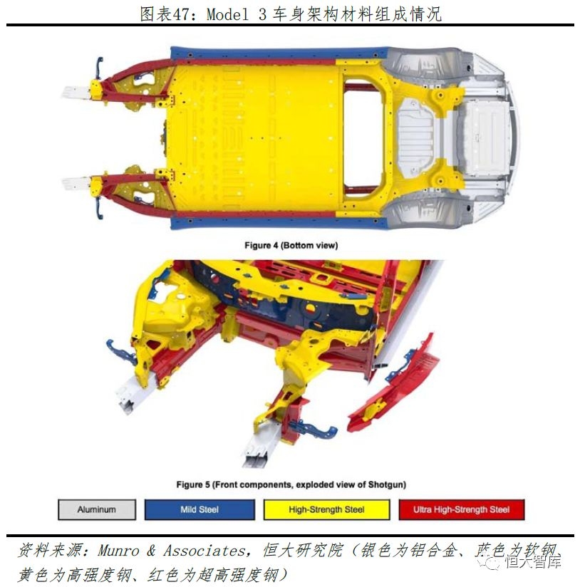 为压缩成本,Model 3车身选择钢铝混合。根据Munro & Associates的拆解报告和车身模型结构图可以发现,Model 3采用铝合金、软钢、高强度钢和超高强度钢这4种材料。由于单电机Model 3为后置电机,为平衡重量,后车身大部分使用质量更轻的铝合金。大部分的纵梁、底板等则采用超高强度钢,增加车身坚固程度以提高安全性。然而,过多的不同类型材料增加连接难度,Model 3车身连接方式便高达5种,且并没有简化不必要配件,反而增加了整车制造成本。