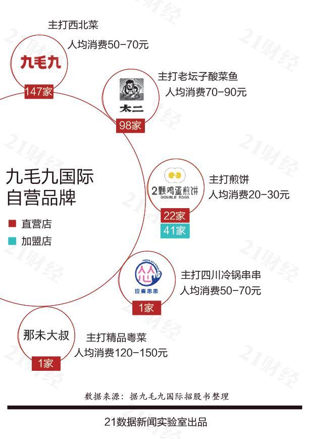 招股书显示,九毛九国际目前经营5个自营的独特品牌,包括以西北菜为主的品牌“九毛九”,现有147间分店;以老坛子酸菜鱼为主的品牌“太二”,现有98间分店;以煎饼为主的“2颗鸡蛋煎饼”,现有22间直营店,41间加盟店;主营四川冷锅串串的品牌“怂”,现有1间直营店;精品粤菜品牌“那未大叔是大厨”,现有1间直营店。