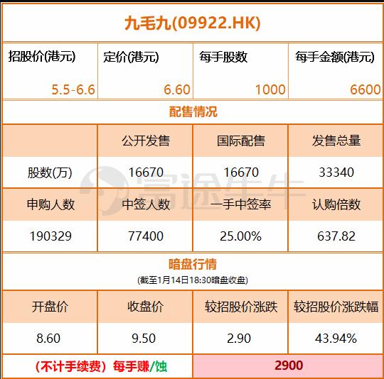 在此前的公开发售阶段,共有190329人参与九毛九的公开配售,一手中签率25%,认购倍数637.82倍,在随后的富途暗盘交易中九毛九收涨43.94%,每手赚2900港元。相关数据如下表: