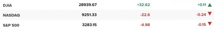 当地时间1月14日,银行股开启新一季财报季,各大银行业绩喜忧参半,三大股指涨跌不一。截至收盘,道琼斯工业平均指数涨0.11%,报28939.67点;纳斯达克综合指数跌0.24%,报9251.33点;标普500指数跌0.15%,报3283.15点。