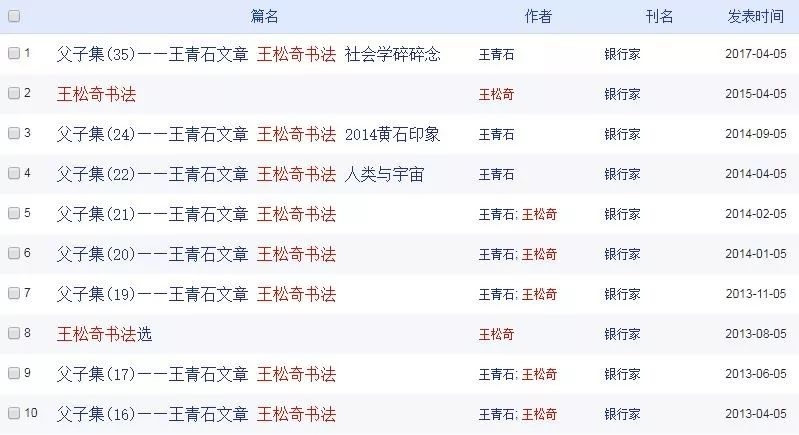 在知网检索发现,王松奇、王青石父子已在《银行家》发表数十篇书法、散文作品。