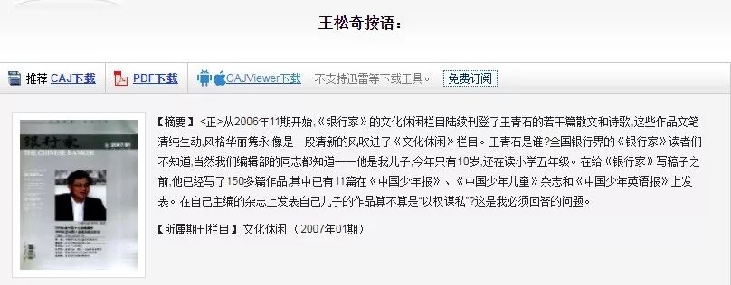 记者检索知网发现,王青石2006年首次在《银行家》发表散文和诗歌时年仅10岁。王松奇还曾在该期刊发表《爸爸的话》,推介儿子新书。
