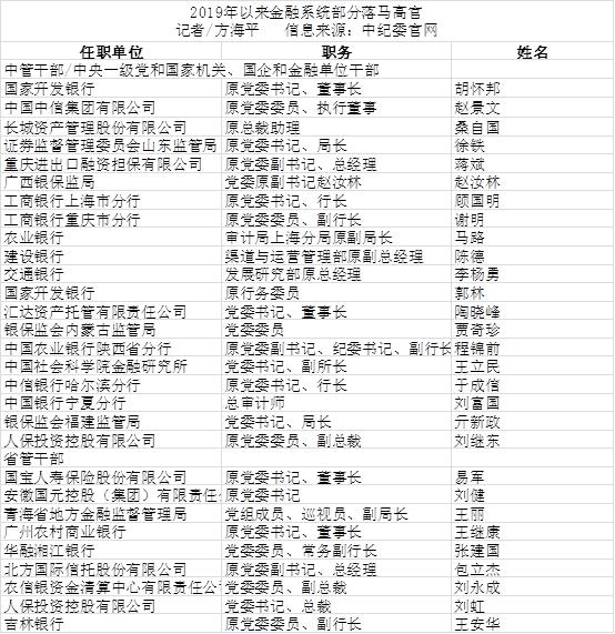 记者统计显示,2019年以来,金融领域落马官员中,中国中信集团有限公司原党委委员、执行董事赵景文,国家开发银行原党委书记、董事长胡怀邦等两名属于中管干部;汇达资产托管有限责任公司党委书记、董事长陶晓峰,中国银行保险监督管理委员会内蒙古监管局党委委员贾奇珍,工商银行上海分行原党委书记、行长顾国明等近二十位属于中央一级党和国家机关、国企和金融单位干部。