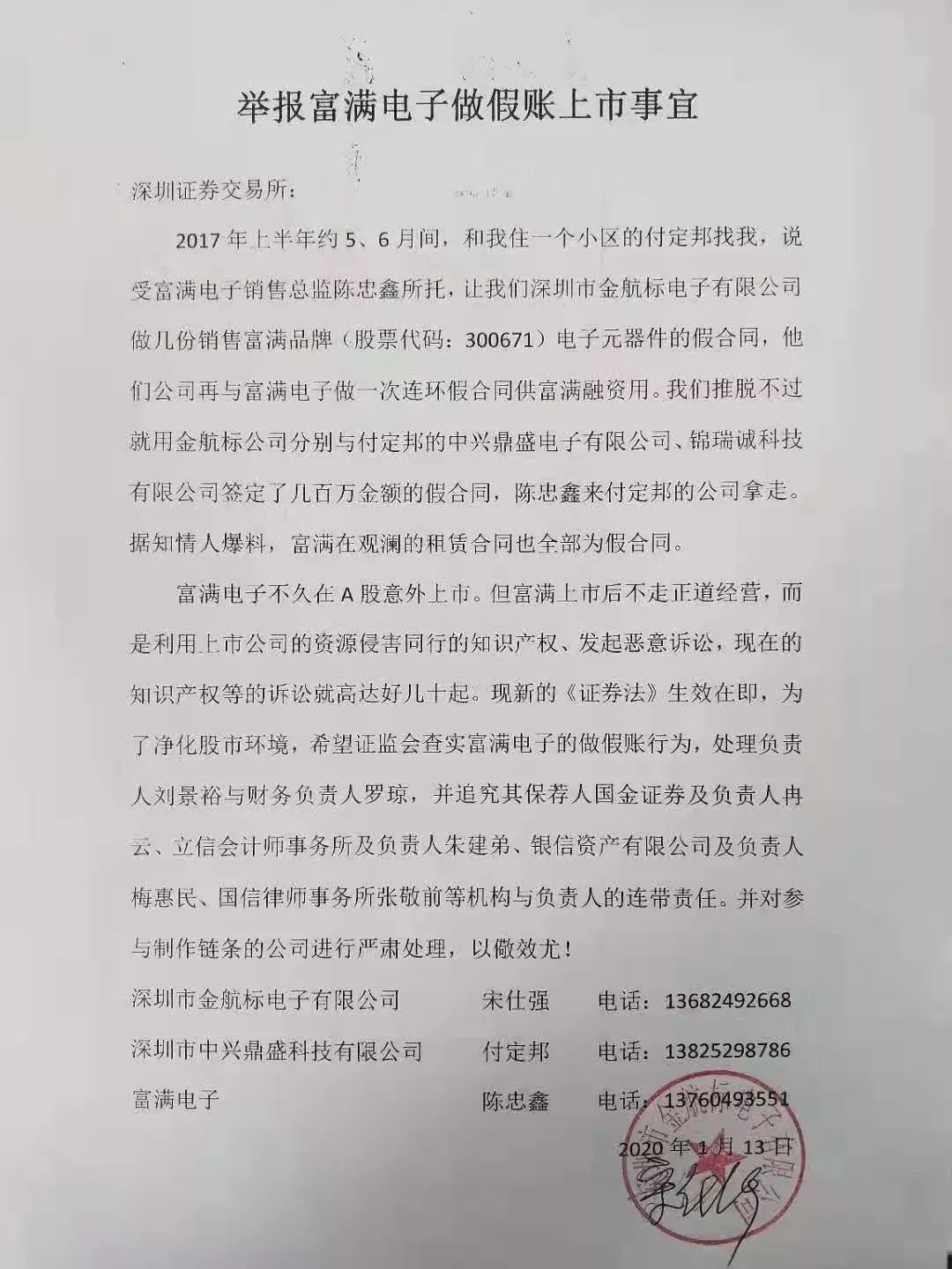 据宋仕强发布在微博上的举报信,富满电子的销售总监陈忠鑫,与宋仕强的邻居付定邦是江西南丰老乡,2017年5、6月份,付定邦找到宋仕强,称受陈忠鑫所托,让金航标与他的公司做几份销售富满电子产品的假合同,富满电子融资用。于是金航标分别与付定邦的深圳市中兴鼎盛电子有限公司、深圳市锦瑞诚科技有限公司签订了几百万的假合同,再与富满电子做连环假合同,供富满电子融资。