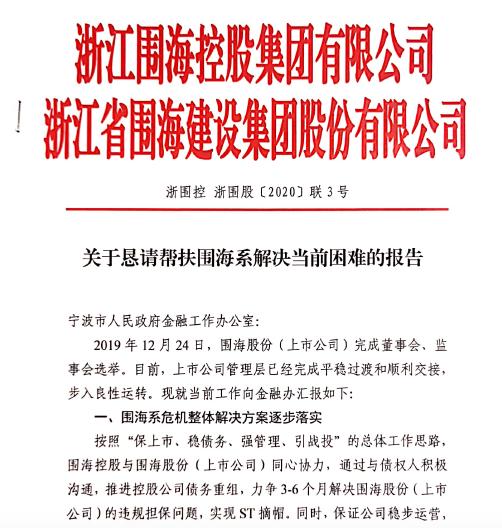 1月16日,21世纪经济报道记者获得一份ST围海(002586.SZ)以及控股股东围海控股向宁波市人民政府金融工作办公室(下称“宁波市金融办”)汇报的红头报告,抬头为《关于恳请帮扶围海系解决当前困难的报告》。