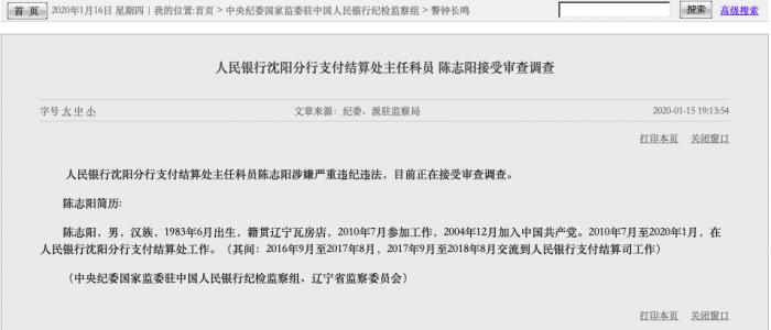 1月15日晚间,央行官网披露,人民银行沈阳分行支付结算处主任科员陈志阳涉嫌严重违纪违法,目前正在接受审查调查。