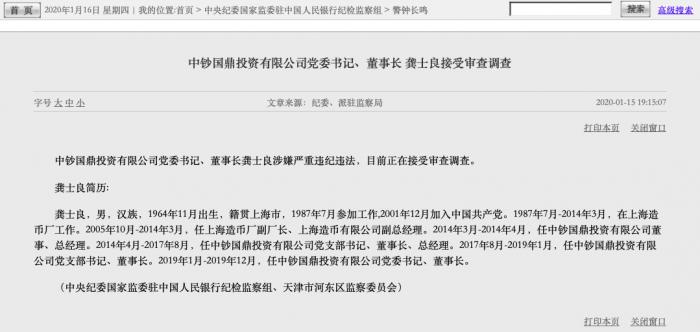央行官网另一则公告显示,中钞国鼎投资有限公司党委书记、董事长龚士良涉嫌严重违纪违法,目前正在接受审查调查。