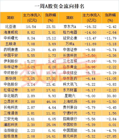海康威视、中科曙光主力资金净流入分别为8.82亿元、8.34亿元,两者分别累计上涨3.81%、15.12%。本周净流入规模较大还有的五粮液、药明康德、中国平安、伊利股份、华林证券等。