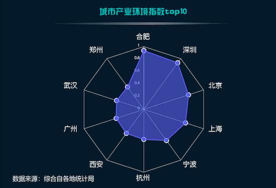 在二级指标城市产业环境指数中,合肥超越深圳、北京、上海排名第一。
