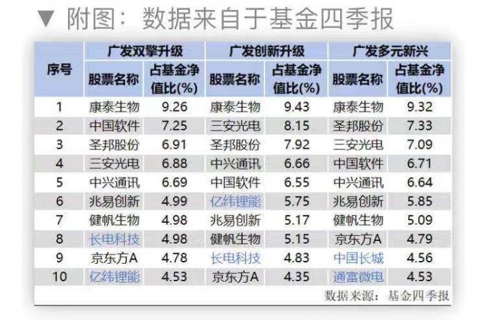 其中2019年业绩排名第一、第二名的广发双擎升级、广发创新升级四季度的10大重仓股重合。