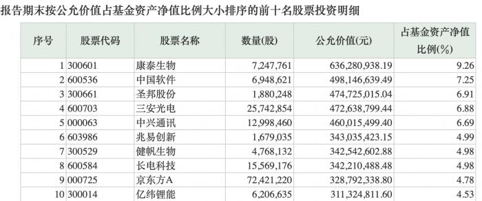 如果把这只冠军基金的三、四季度重仓股对比,其中6只股票没有变,包括康泰生物、中国软件、圣邦股份、三安光电、长电科技、亿纬锂能。减少了4只股票,包括药石科技、华天科技、通富微电、同花顺。增加了4只股票,包括中兴通讯、兆易创新金、健帆生物、京东方。