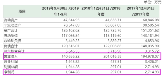 与此相对应,ST亚星2017年和2018年的营业收入分别为19.50亿元、20.10亿元,但净利润仅为2661.46万元、310.75万元;2019年前三季度,ST亚星的营业收入和净利润分别为14.07亿元和1954.01万元。