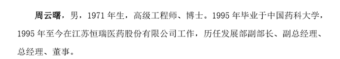 新任董事长周云曙,称得上是“老恒瑞人”。自1995年进入恒瑞医药,周云曙历任发展部副部长、副总经理、总经理、董事,至今在公司任职近20年。从他的履职变化来看,孙飘扬多年前就为自己的角色转变做好了谋划和准备。