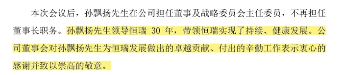 恒瑞医药在公告中表达对孙飘扬的敬意和感谢,“孙飘扬先生领导恒瑞 30 年,带领恒瑞实现了持续、健康发展。公司董事会对孙飘扬先生为恒瑞发展做出的卓越贡献、付出的辛勤工作表示衷心的感谢并致以崇高的敬意。”