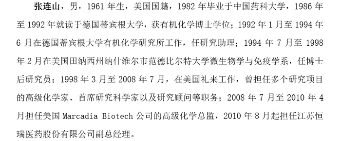目前负责恒瑞医药创新药研发的副总经理张连山,2010年归国后加入恒瑞医药,任职近10年。张连山此前在美国礼来曾担任多个研究项目的高级化学家、首席研究科学家以及研究顾问等职务。