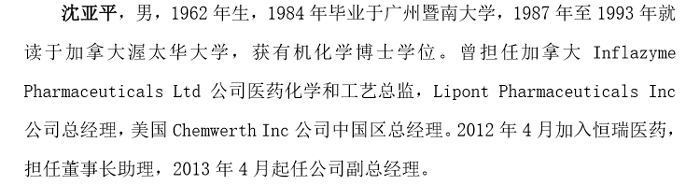 负责恒瑞医药国际业务的副总经理沈亚平,2012年加入恒瑞医药。曾在加拿大、美国多家跨国药企担任主要负责人。