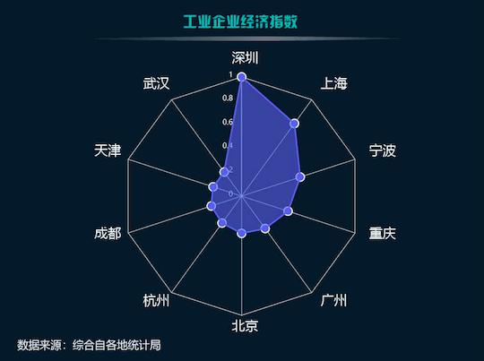 深圳在所有城市中脱颖而出,是因为其在各项指标上均排名靠前。比如二级指标方面,深圳的产业发展指数排名第一,产业环境指数、绿色制造指数排名第二。