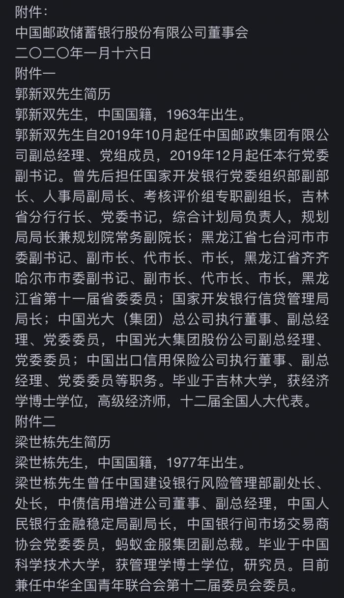 1月17日邮储银行发布公告称,董事会通过提名郭新双为执行董事候选人、聘任为行长的议案。