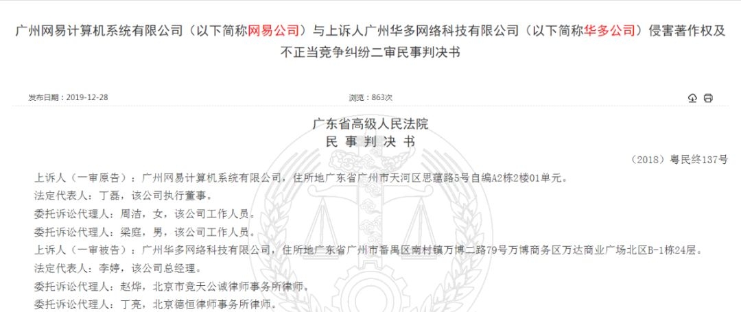 2019年12月10日,广东省高级人民法院,对广州网易计算机系统有限公司,诉广州华多网络科技有限公司(就是YY)的案件,进行了判决。
