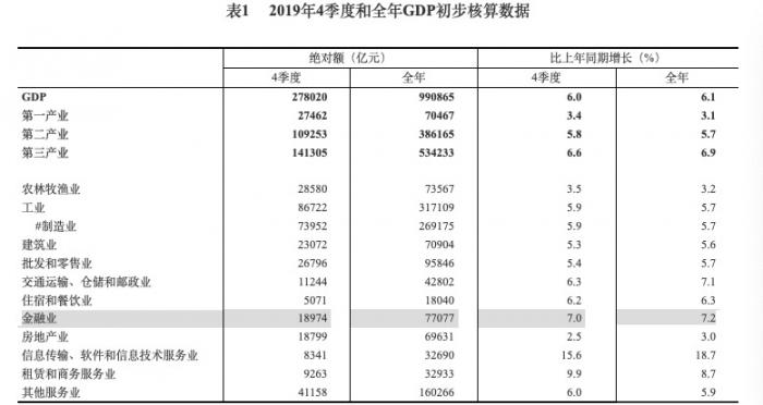 国家统计局1月18日公布的2019年四季度和全年国内生产总值(GDP)初步核算结果显示,2019年金融业增加值增速为7.2%,其增速仅次于信息传输、软件和信息技术服务业及租赁和商务服务业,高于其他行业,金融业增加值增速相对较高。
