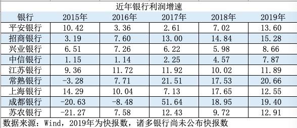 比如平安银行、招商银行、兴业银行、中信银行2019年净利润增速(快报数)分别为13.60%、15.28%、8.66%、7.87%,增速均创五年新高。