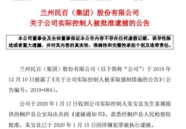 1月17日晚,兰州民百发布公告称,公司实际控制人朱宝良已于1月15日因涉嫌犯罪被执行逮捕。