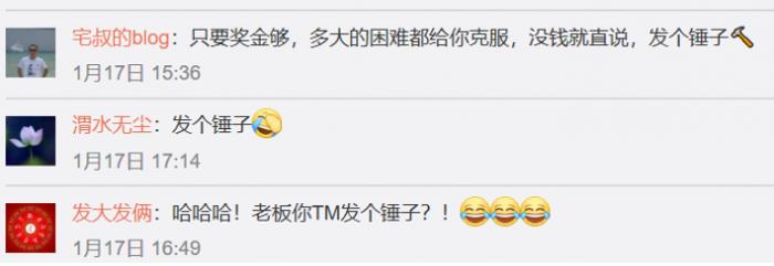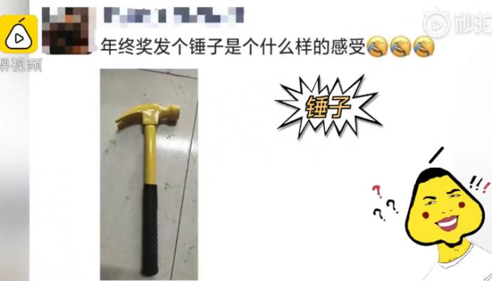 1月16日,山西运城某公司企划部门年底向员工发放年终奖,除了奖金之外还每人发了一个锤子。领导解释说,发锤子的目的是为了激励员工,在新的一年里像锤子一样,不怕困难迎难而上。如此创意的方式,还上了当天的微博热搜,引起网友阵阵吐槽。
