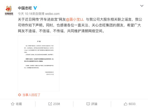1月19日,忠旺集团回应称,微博用户@露小宝LL 发布的房产与忠旺集团或刘先生均无任何关系。刘先生本人并不认识该微博用户@露小宝LL 或其家属。