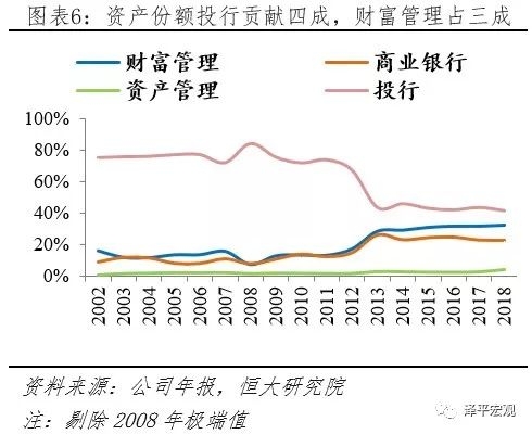 三是利润上财富管理占比近半,2018年财富管理、商业银行、投行、资产管理的营业利润贡献分别为48%、25%、22%、6%。2010年后财富管理成为第一大利润来源,占比从30%提升了18个百分点。