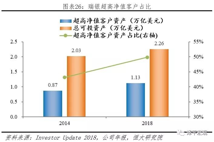 三是资产管理部门,发行公募、私募、房地产投资基金产品,可供财富管理客户投资。2018年在资产管理板块中,瑞银所管理的7810亿美元中有2190亿美元来自集团内财富管理业务提供的,占比28%。