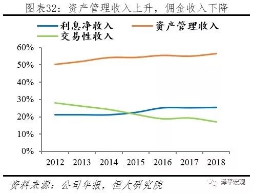 一是资产上投行占比最高,2018年投行、财富管理、商业银行、资产管理的资产占比分别为42%、32% 、22%、4%。投行的资产份额最高,但比重从2010年72%下降了30个百分点,同期财富管理提升20个百分点,位列第二大资产来源。