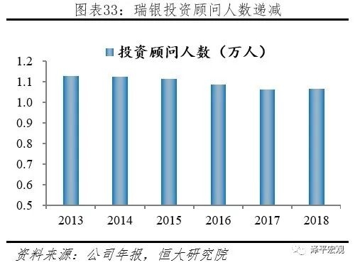 削减顾问成本,提升前线团队质量和效率。瑞银将投资顾问打造为维系客户关系的核心,具体做法包括1)提高办公自动化、数字化水平;2)采用团队协作模式,将不同领域的投资顾问划分为5-50人团队,截至2018年三季度,纳入团队的顾问约占全体顾问50%,不仅为客户提供全方位服务,而且可以减少因个别顾问离职而带走客户资源的情况,减少客户流失率;3)帮助顾问成为持牌金融咨询师,形成稳定的职业规划,顾问离职率从2014年4%下降2018年3%。2013-2018年雇佣投资顾问从1.13万人下降至1.07万人,累计下降5个百分点,但人均贡献营业利润从309万美元提升至340万美元,特别是2017-2018年财富管理美洲部门和全球部门合并,大幅缩减成本、效益提升。