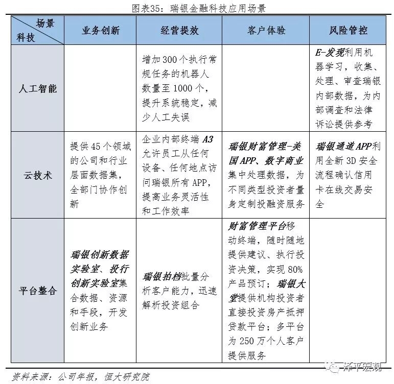 瑞银关注云技术、机器人、人工智能等领域,应用于成本节约、提升客户体验、风险管理等领域。1)云技术。传统的服务器存储数据造价高,容易造成浪费,云技术存储可以更高效地处理高峰时段订单,目前瑞银已经将三分之一的数据转移到私有云上,未来四年,瑞银目标将数据分散存储在服务器、私有云和公有云上。2)人工智能。截至2018年瑞银投入使用1000台机器人,帮助投资顾问解答客户问题,减少人工操作错误。并在更复杂的业务中加入机器学习,用于风险管理和反洗钱识别。3)开放平台。瑞银致力于平台资源整合和开放,例如构建财富管理平台One WMP,将全球范围内提供的产品和服务整合;又如与供应商组建合作伙伴平台,允许上下游公司联合提供产品,提升客户服务体验。